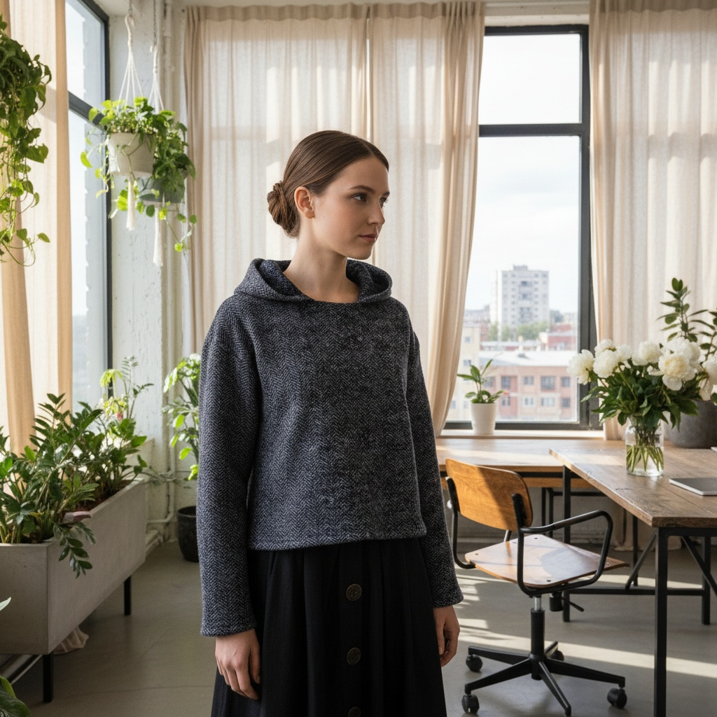 Croiala este oversize, lejeră, în stilul acela care lasă corpul să respire și fiecare gest să fie firesc. Hanoracul este realizat pe mărimi europene, respectând proporțiile reale ale corpului și mișcarea naturală a femeii.