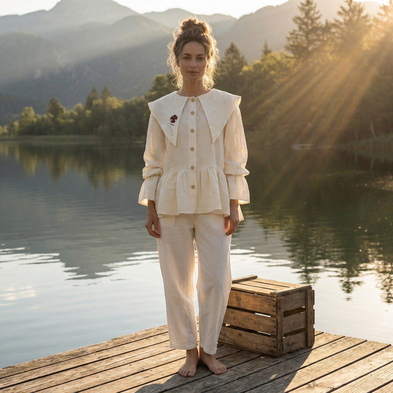 Această cămășuță cu guler generos, care cade delicat peste umeri, e mai mult decât un obiect vestimentar. E un ritual de feminitate blândă.