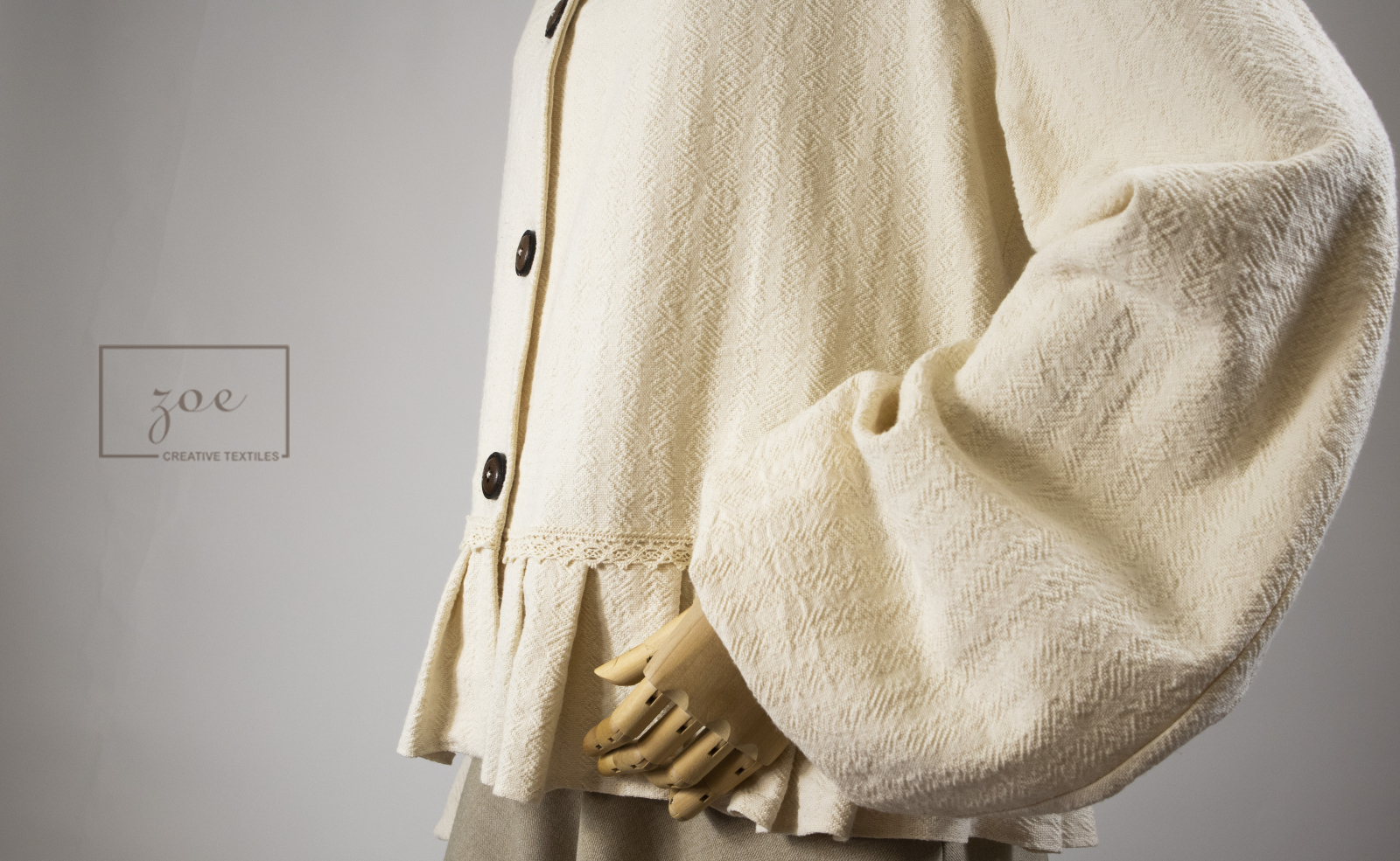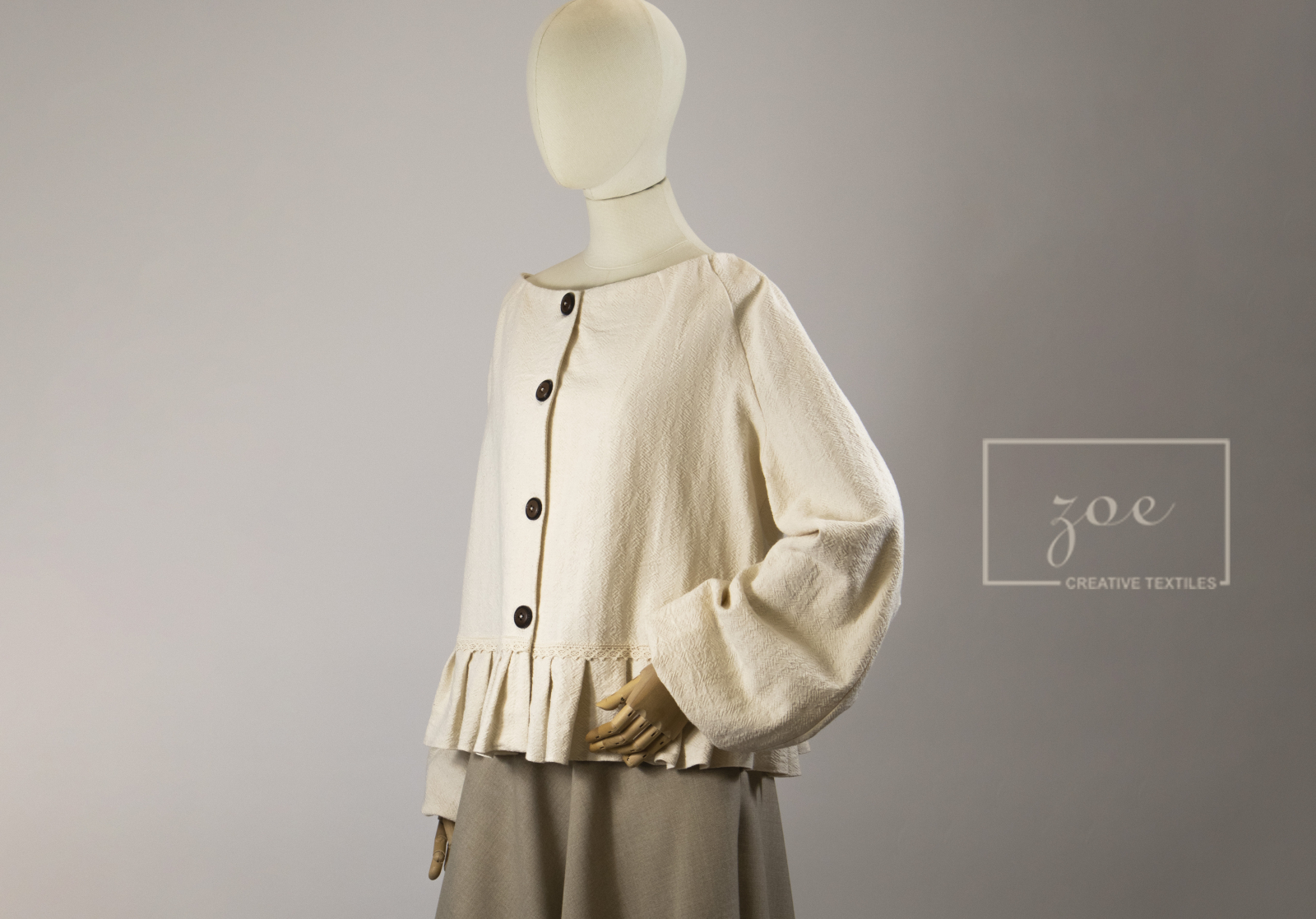 Nasturii din lemn, mici și naturali, închid cămașa cu farmec rustic, iar pliurile în talie și mânecile simple dau forma unei siluete armonioase, păstrând totodată aerul clasic și discret.