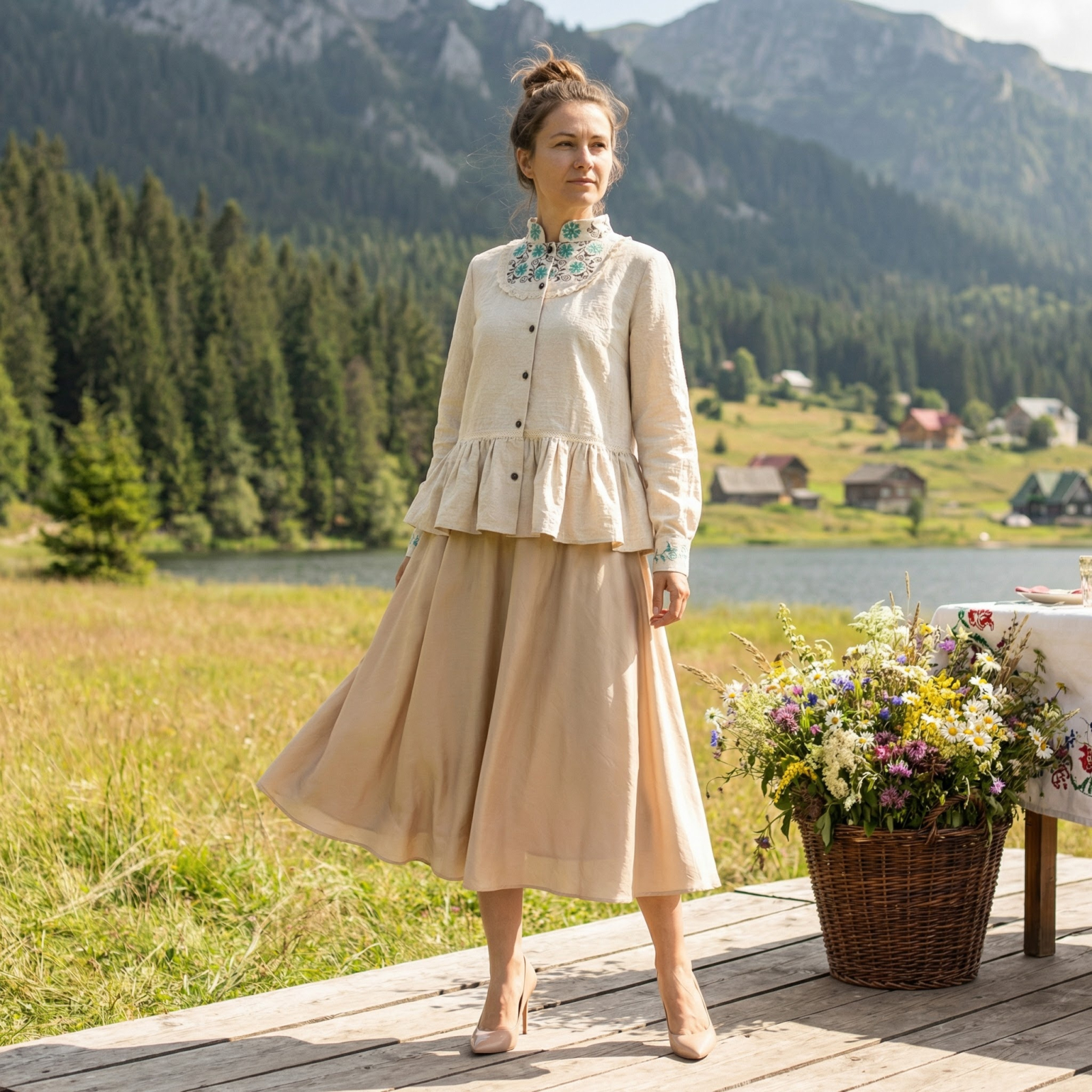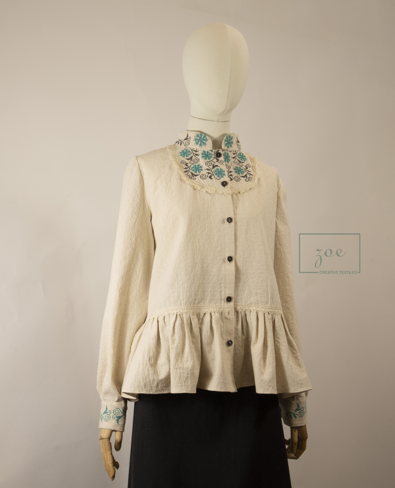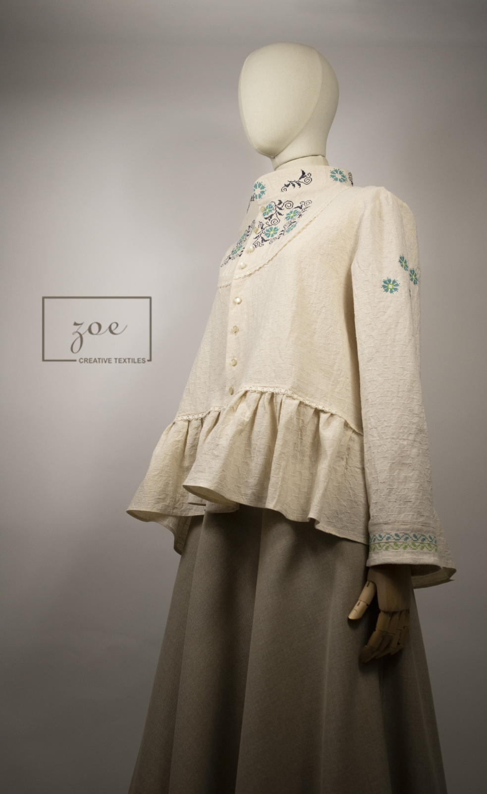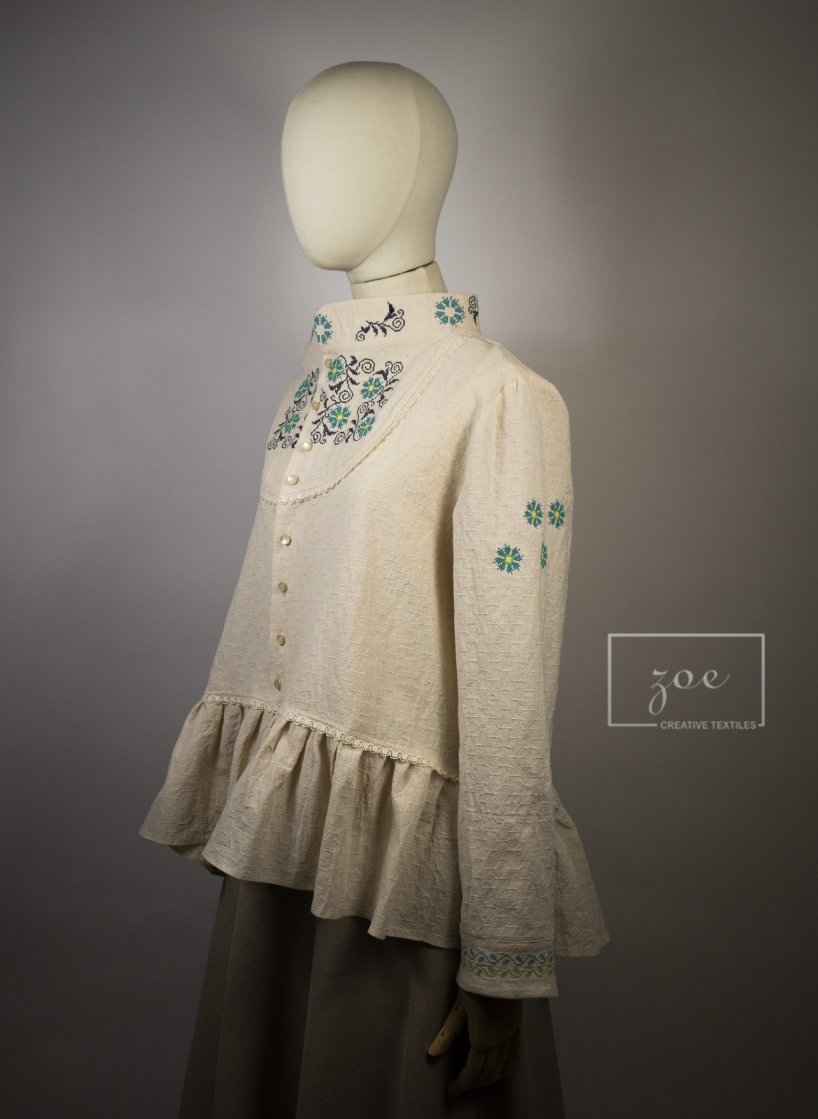 Broderia delicată, realizată computerizat, înfrumusețează pieptul, gulerul și mânecile lungi, aducând un strop de eleganță modernă, păstrând totodată legătura cu folclorul românesc. Pliseurile în talie subliniază feminitatea, conturând subtil silueta, iar dantela fină din bumbac adaugă o notă de rafinament și delicatețe.