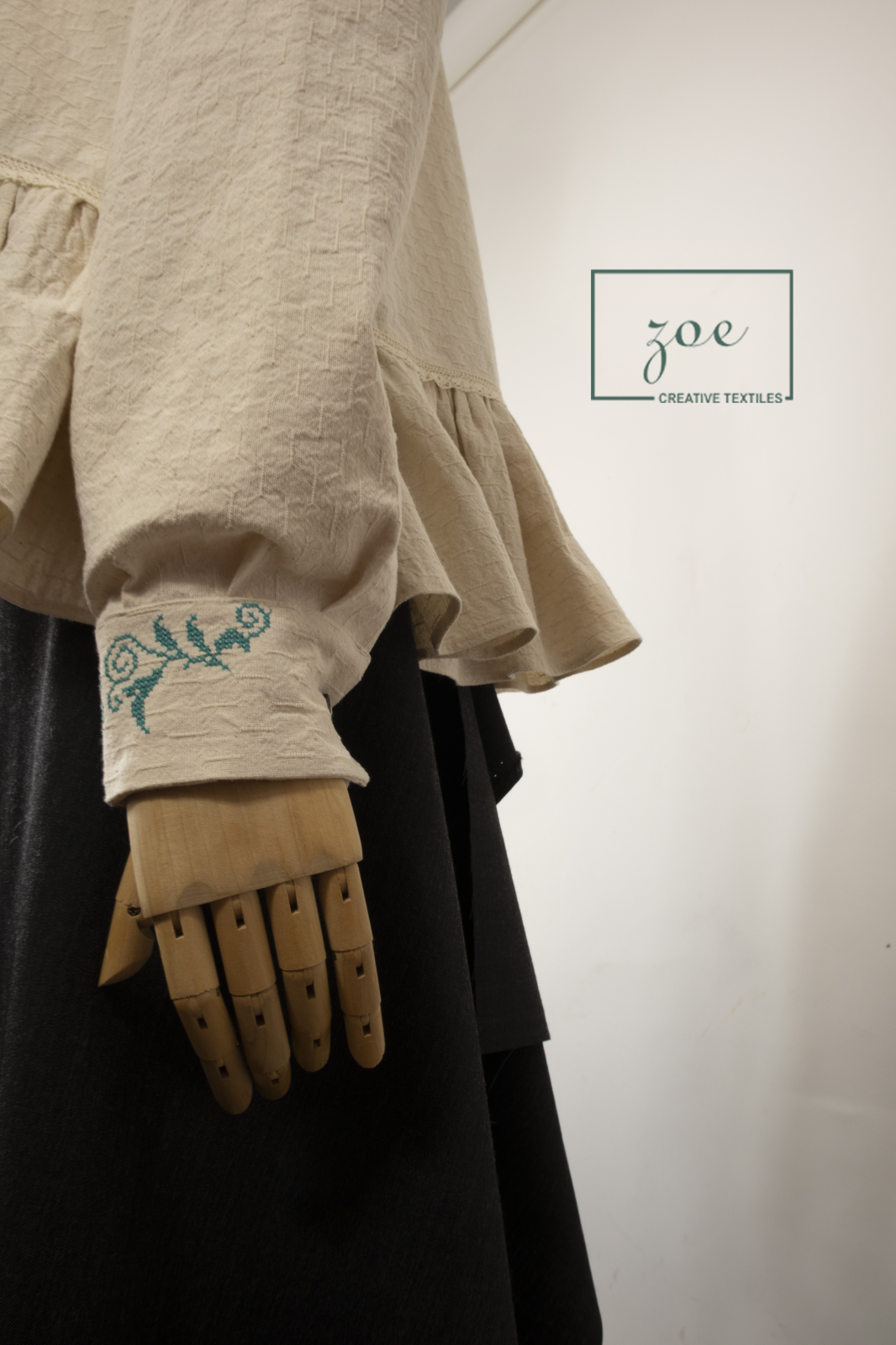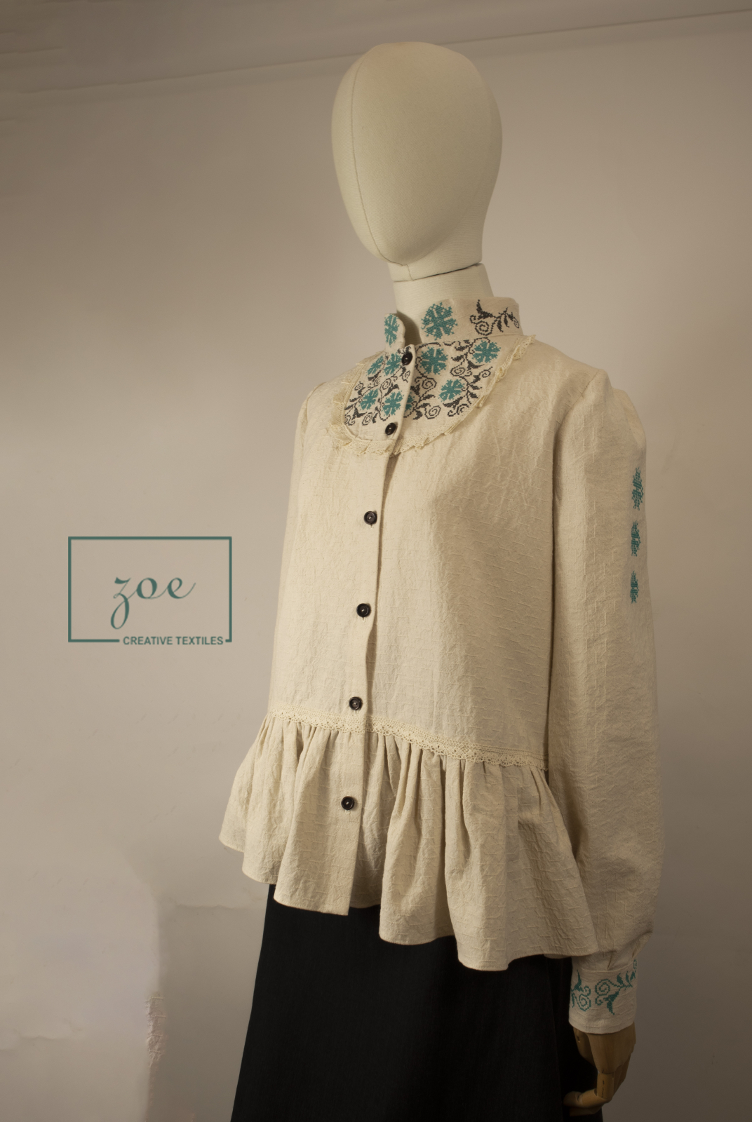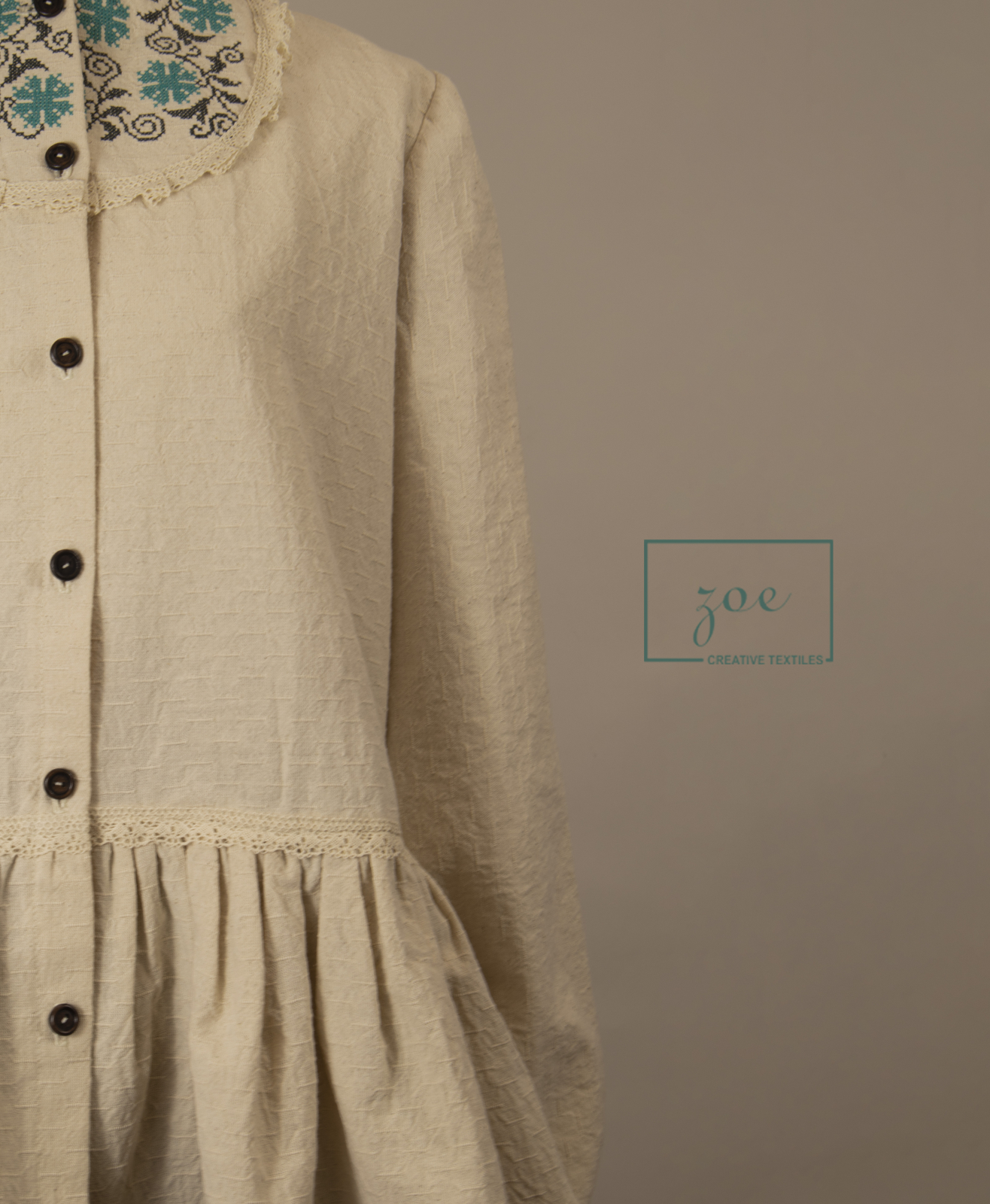 Broderia delicată, realizată computerizat, înfrumusețează pieptul, gulerul și mânecile lungi, aducând un strop de eleganță modernă, păstrând totodată legătura cu folclorul românesc. Pliseurile în talie subliniază feminitatea, conturând subtil silueta, iar dantela fină din bumbac adaugă o notă de rafinament și delicatețe.