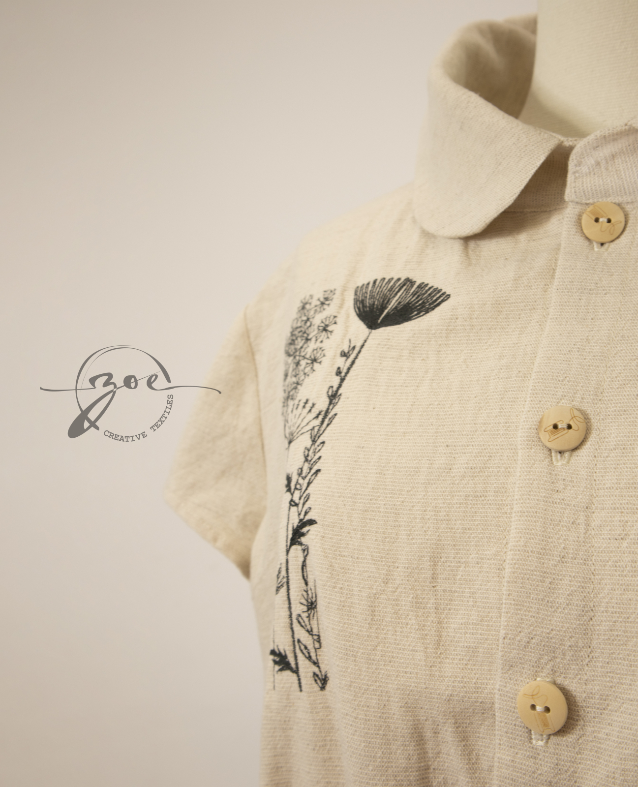 Designul rochiei combină simplitatea cu feminitatea subtilă: broderia florală delicată, inspirată din florile de câmp, adaugă un plus de originalitate și rafinament, iar pliurile fine din talie subliniază silueta și conferă volum elegant. Închiderea frontală cu nasturi de lemn aduce un aer rustic și autentic, oferind în același timp ușurință în îmbrăcare, iar gulerul rotunjit clasic completează armonios aspectul rafinat al rochiei.