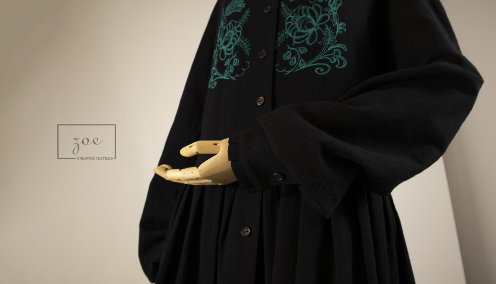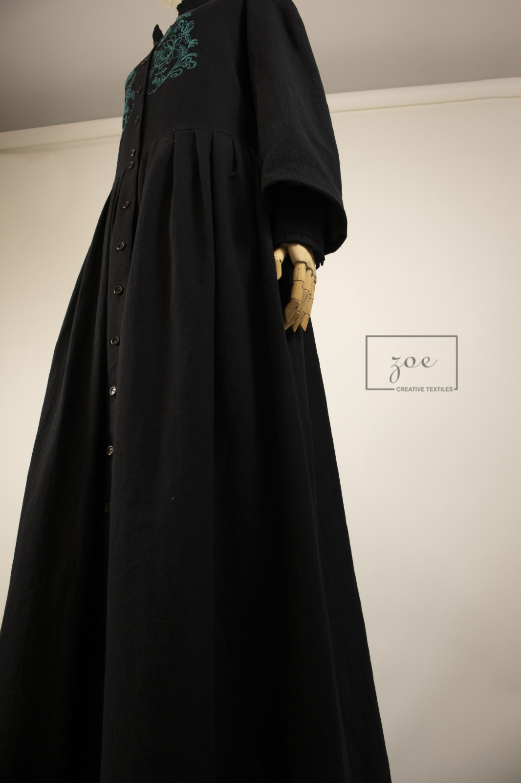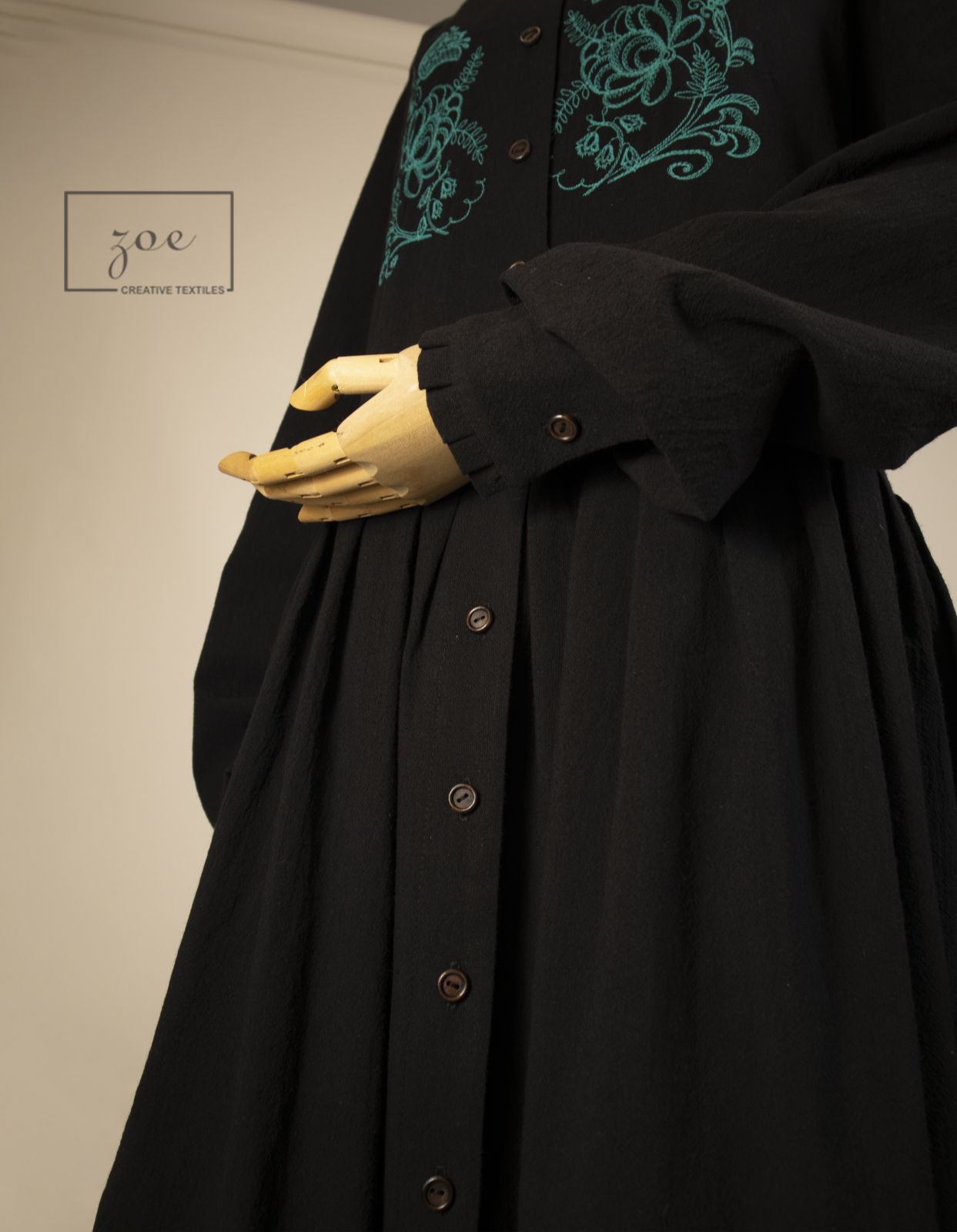 Această rochie neagră, confecționată din pânză autohtonă de înaltă calitate și completată de broderie florală și pliseuri elegante, este alegerea perfectă pentru momente speciale, conferind fiecărei apariții feminitate, stil și rafinament.