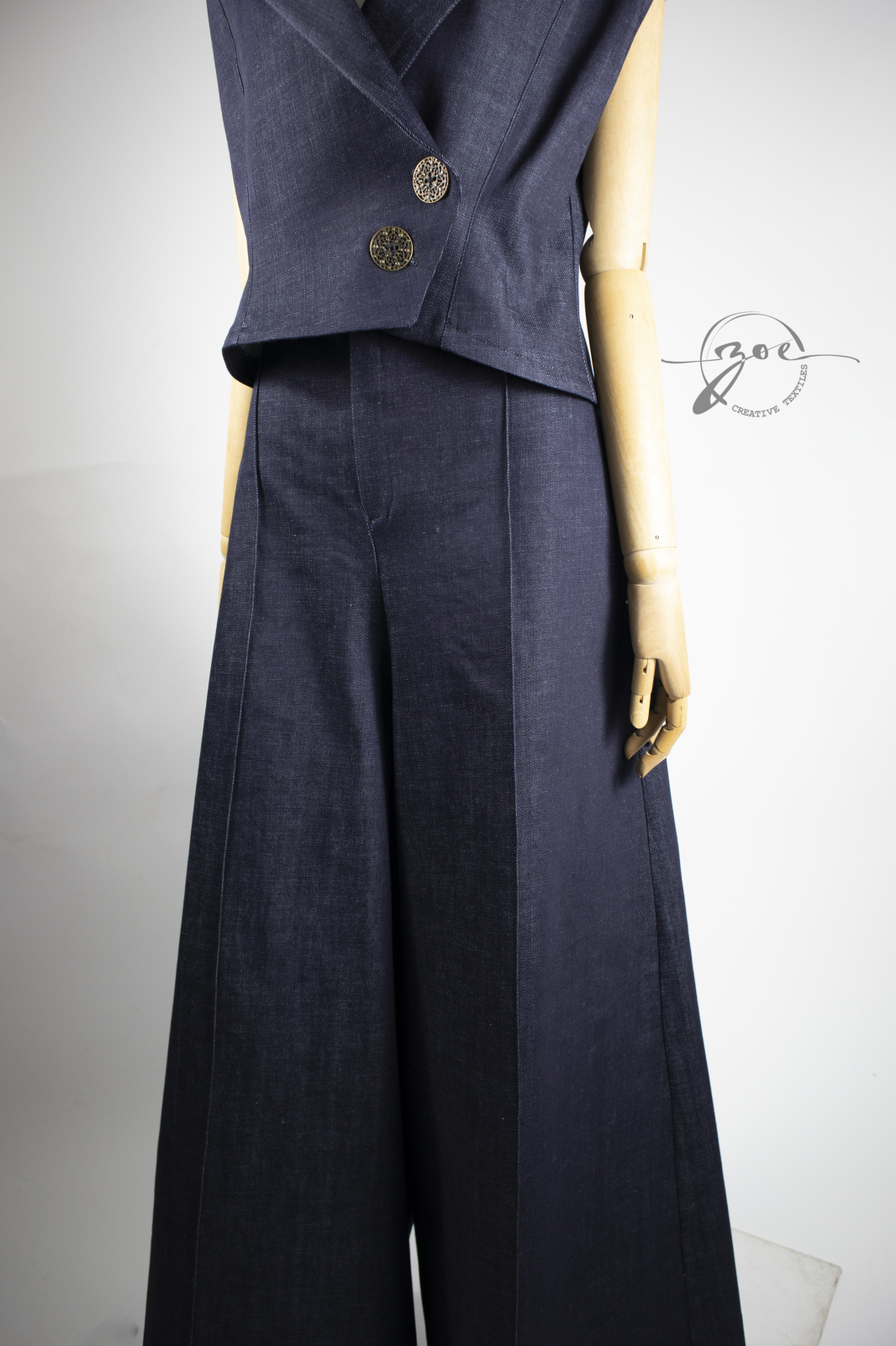 Evazați generos, croiți lejer în talie, pantalonii dau impresia unei fuste lungi, elegante. Denim-ul compact păstrează linia curată, suplă, și nu preia forma corpului — ceea ce oferă confort, siguranță și o eleganță naturală.