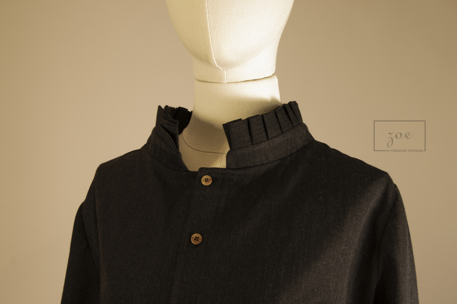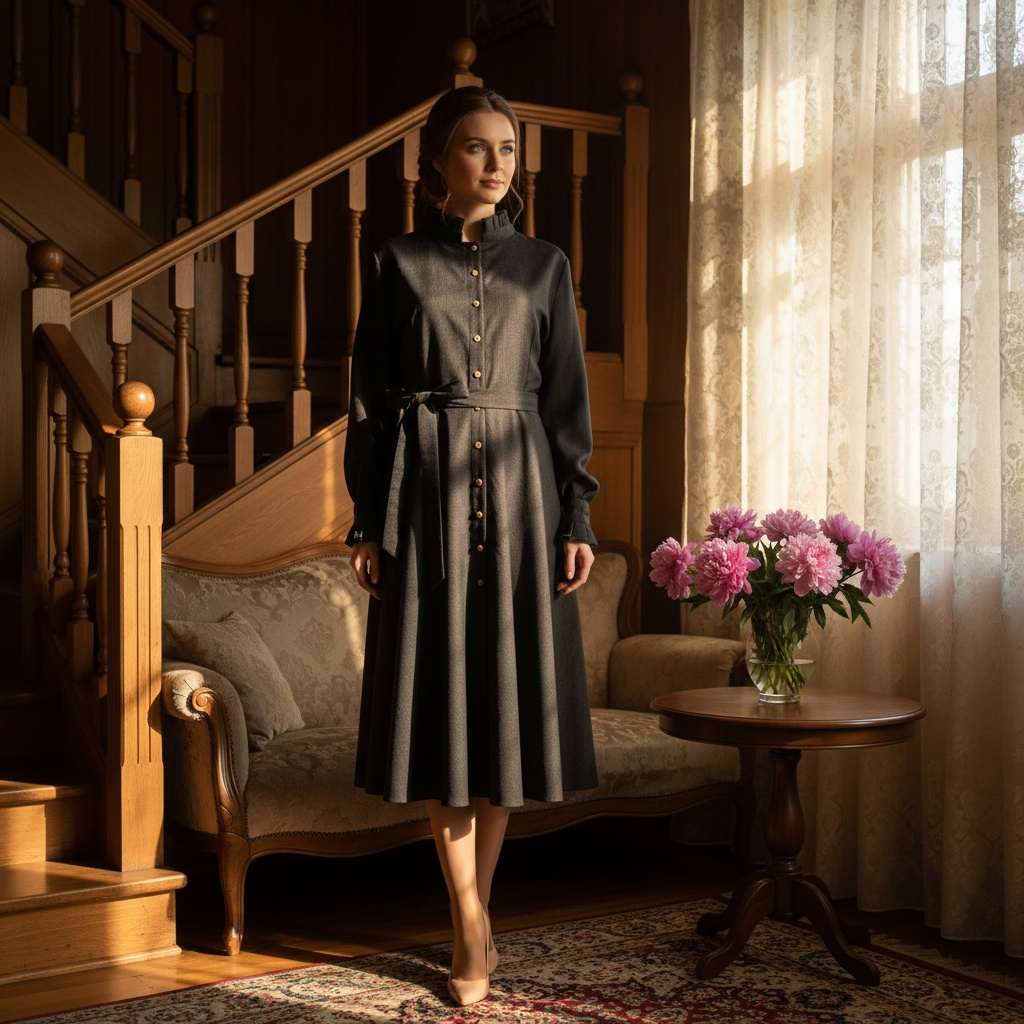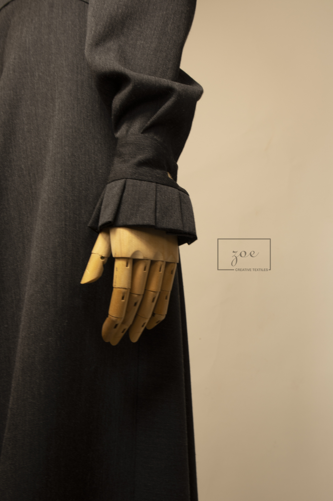 Designul aduce elemente baroc subtile: pliuri fine la guler și la manșete, care dau volum delicat și o notă romantică, în timp ce poalele cloș creează mișcare și eleganță. Închiderea frontală cu nasturi adaugă un detaliu clasic, iar cordonul reglabil permite ajustarea taliei, pentru a sublinia linia naturală a corpului.
