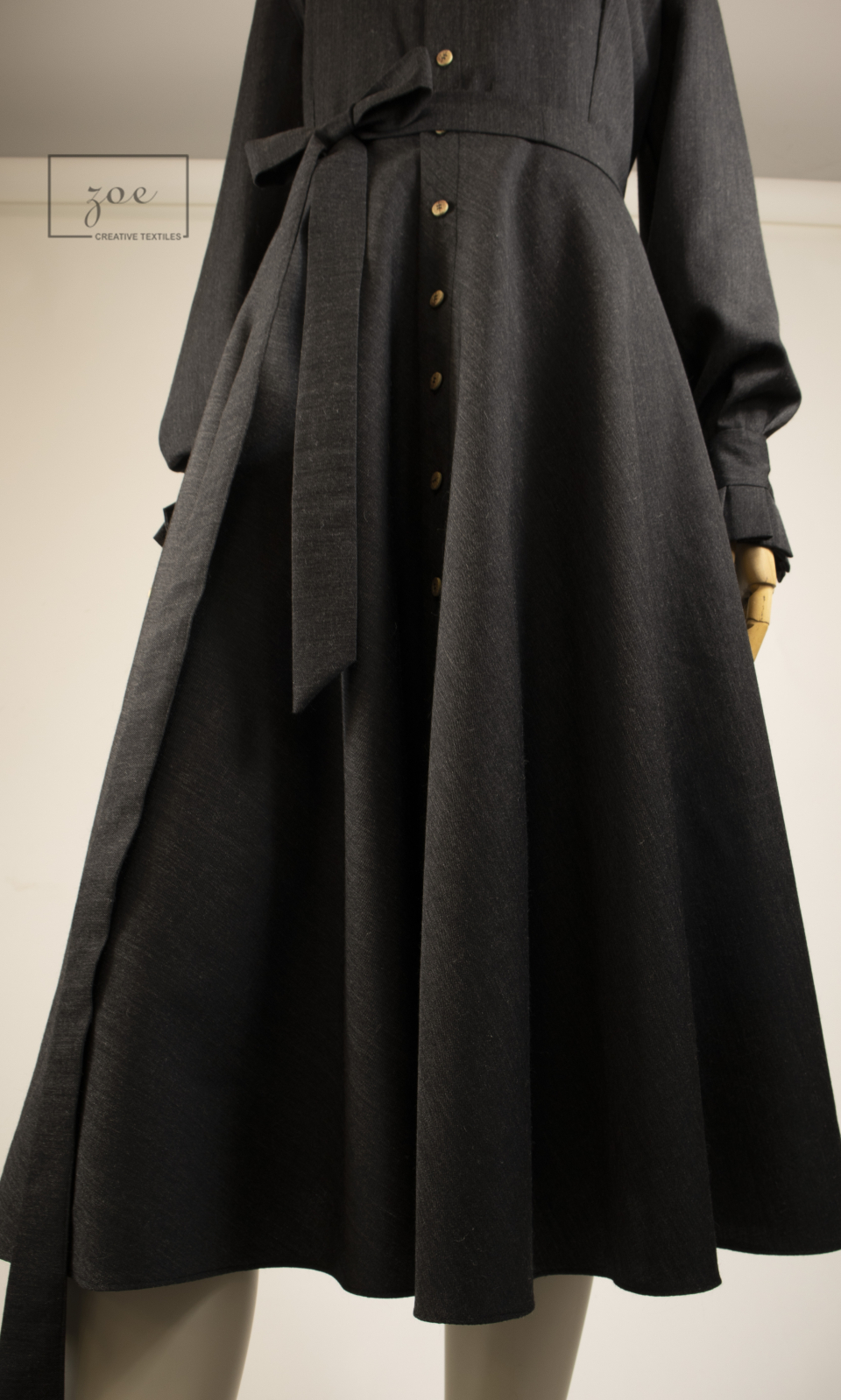 Rochia Zoe este realizată din stofă de lână ușoară (60% lână, 40% PES), cu cădere fluidă și textură moale, care se mișcă natural odată cu tine, fără să strângă sau să rigidizeze. Interiorul este căptușit cu vâscoză, pentru confort și respirabilitate pe tot parcursul purtării.