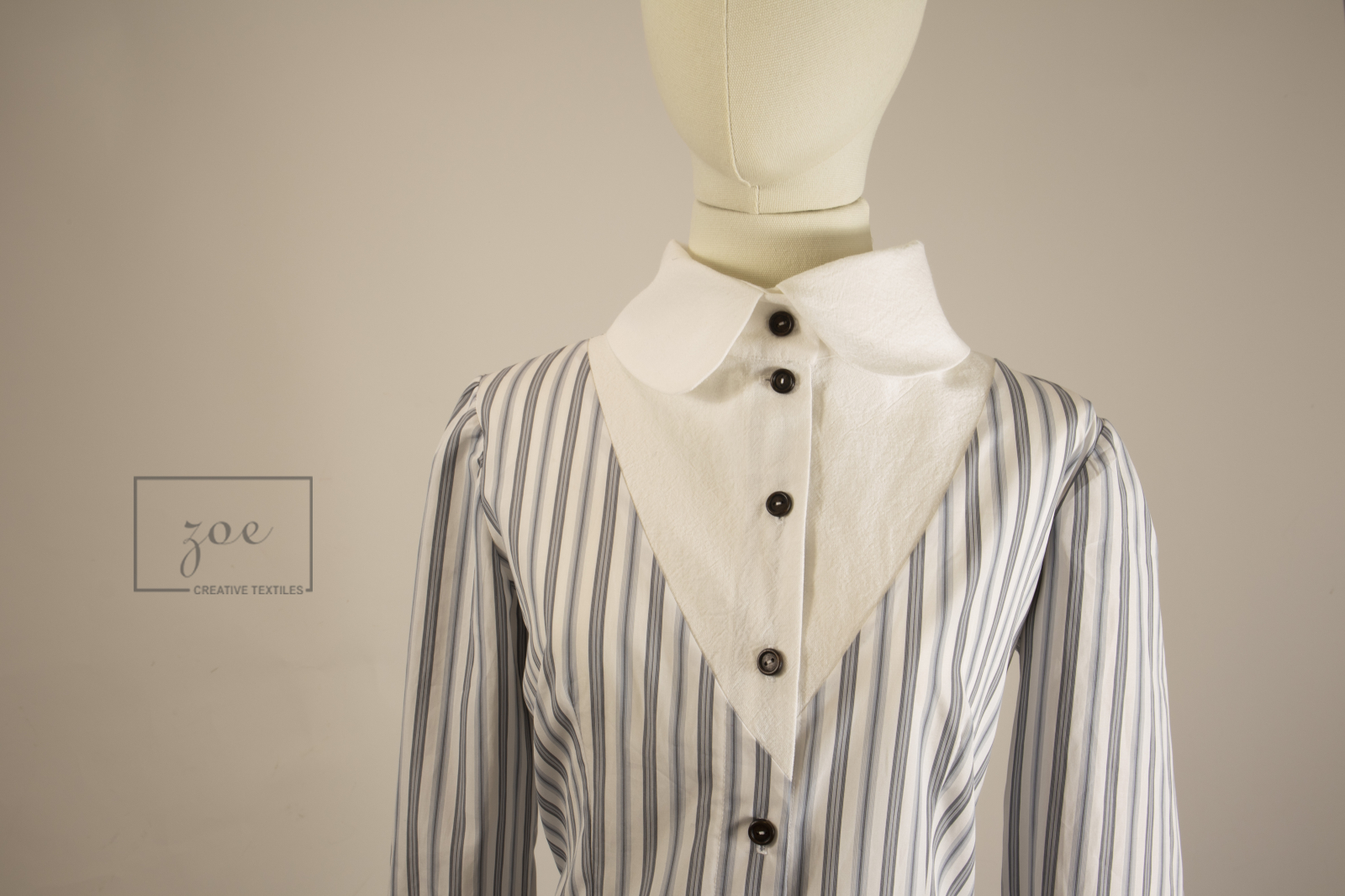 Mâneci lungi și guler tip cămașă cu cap rotund, din pânză topită albă, detalii ce evocă o noblețe discretă și aduc un subtil contrast textural.