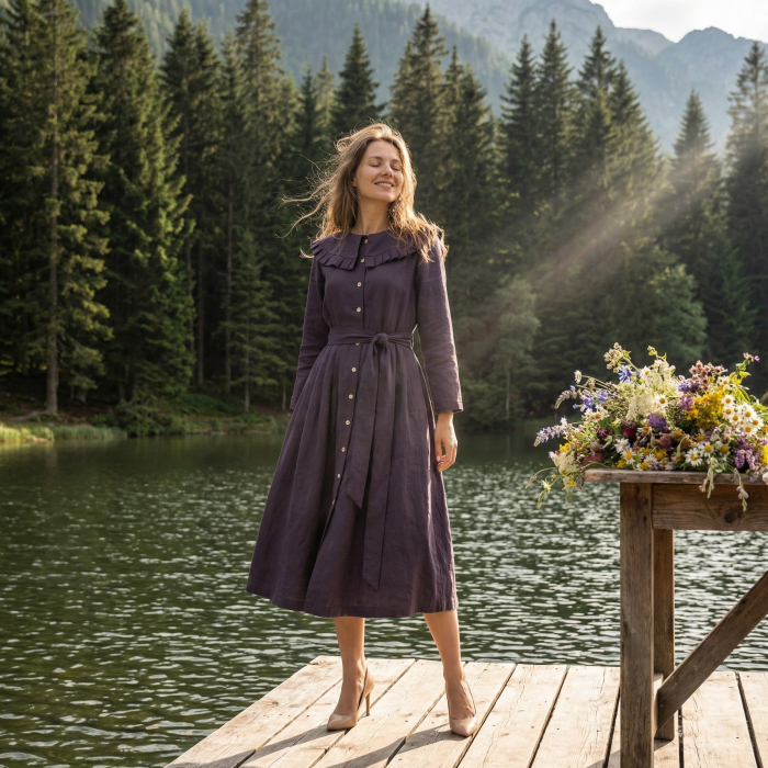 Gulerul cu pliuri și pliurile din talie conferă un aer elegant și rafinat, evidențiind silueta feminină cu delicatețe. Închiderea cu nasturi completează subtil designul tradițional, iar cordonul ajustabil permite personalizarea formei rochiei, pentru o potrivire perfectă.