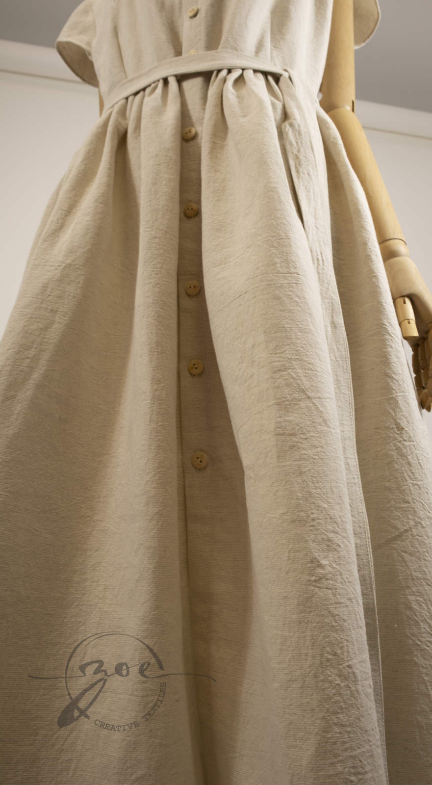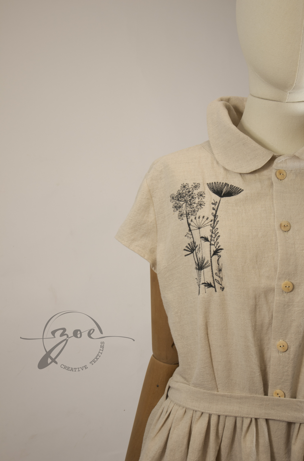 Designul rochiei combină simplitatea cu feminitatea subtilă: broderia florală delicată, inspirată din florile de câmp, adaugă un plus de originalitate și rafinament, iar pliurile fine din talie subliniază silueta și conferă volum elegant. Închiderea frontală cu nasturi de lemn aduce un aer rustic și autentic, oferind în același timp ușurință în îmbrăcare, iar gulerul rotunjit clasic completează armonios aspectul rafinat al rochiei.