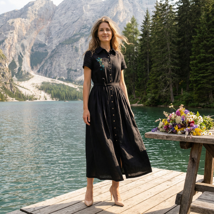 Designul clasic și feminin al rochiei include nasturi în față, care adaugă un plus de autenticitate și facilitează îmbrăcarea rapidă, pliuri în talie care subliniază silueta și conferă volum și eleganță, și mâneci scurte ideale pentru libertate de mișcare. Gulerul de cămașă adaugă un aer rafinat, în timp ce broderia digitală cu flori oferă un strop de originalitate și frumusețe naturală. Croiala lejeră garantează confort maxim și versatilitate, făcând rochia potrivită pentru orice moment al zilei.